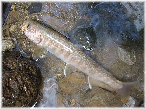 20センチにどうにか届く痩せたイワナが釣れてくれた。 |